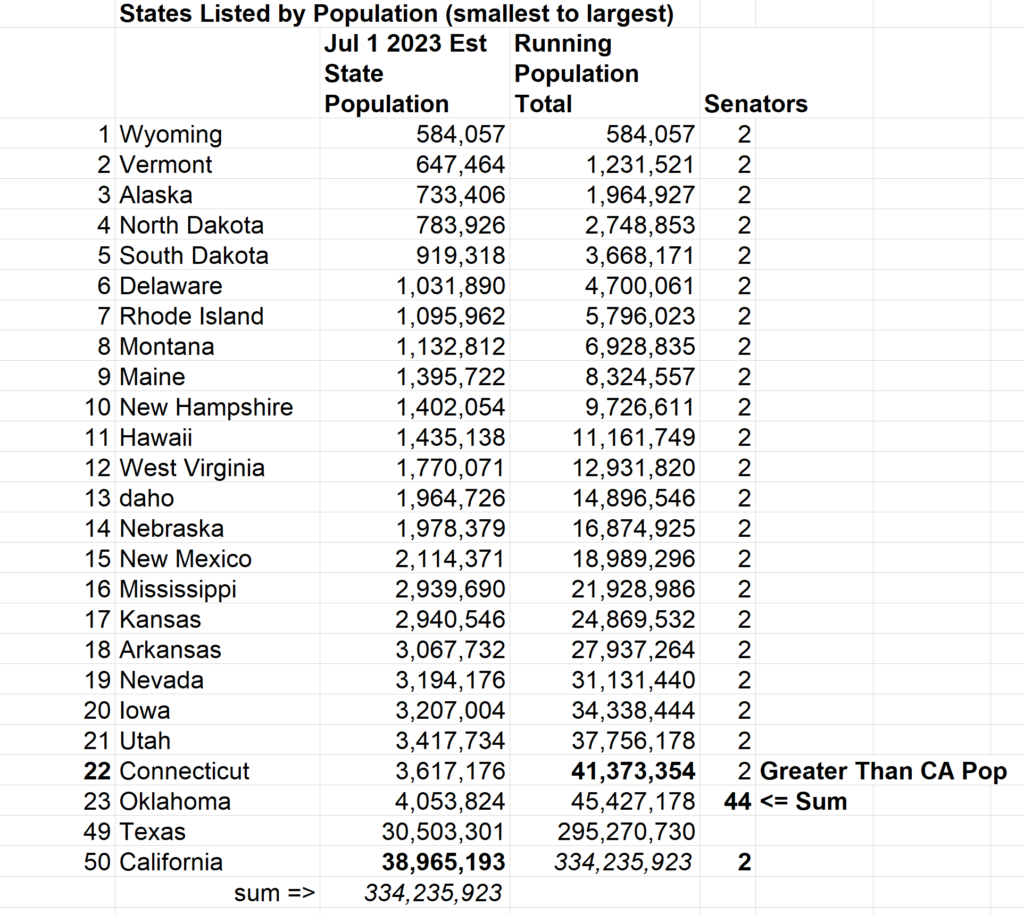 “All of this is further exacerbated by the widening gap between populations and how they are represented in government. All states have two senators, which means that Wyoming, with a population of under six hundred thousand, has the same representation in the Senate as California, with a population of some forty million.